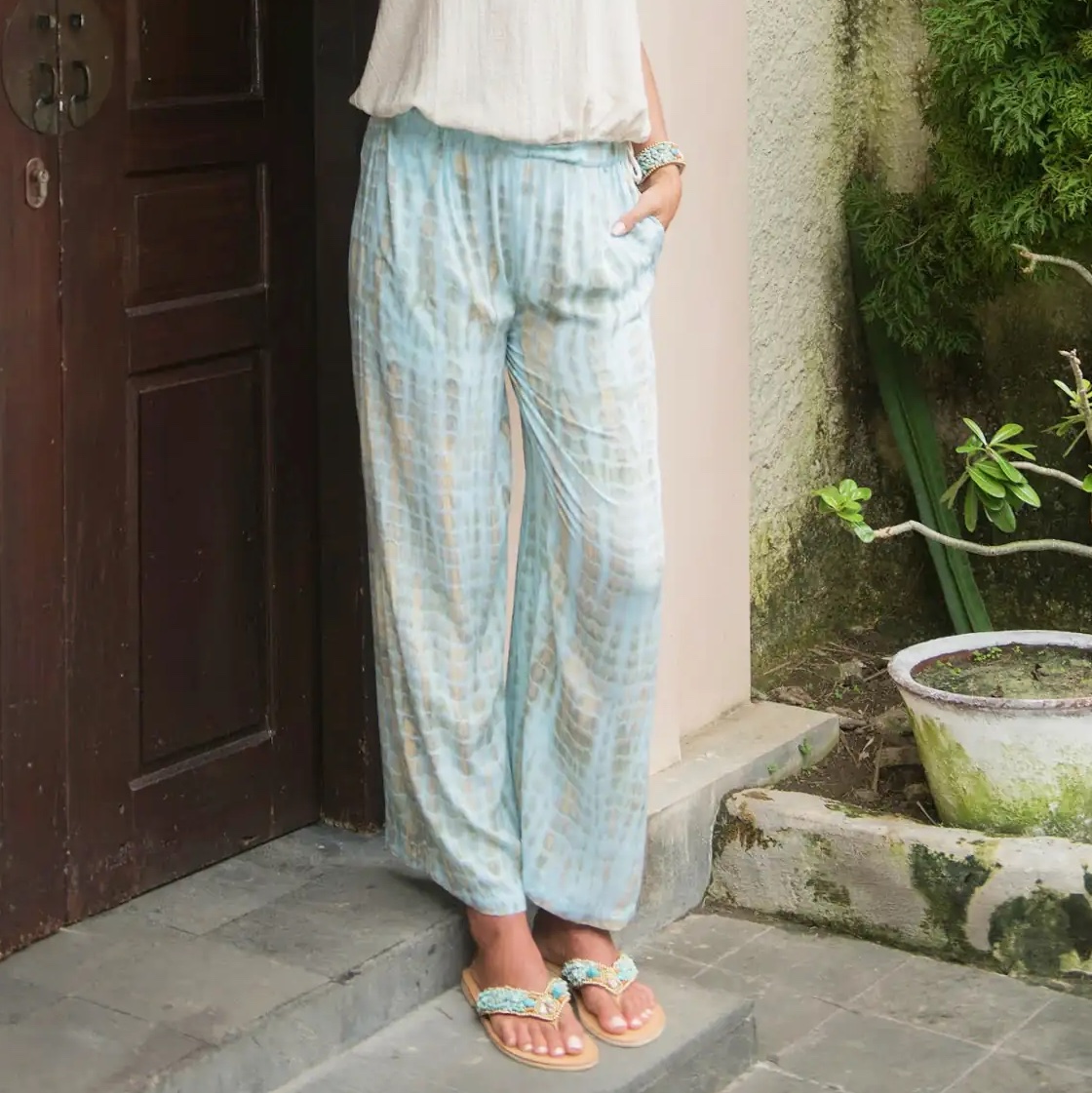 Tweedelige set uit rayon voile, handgemaakt in Bali. Top met een V-hals, korte mouwen en een speelse strik aan de voorkant. Losse broek met rekker en zakken.