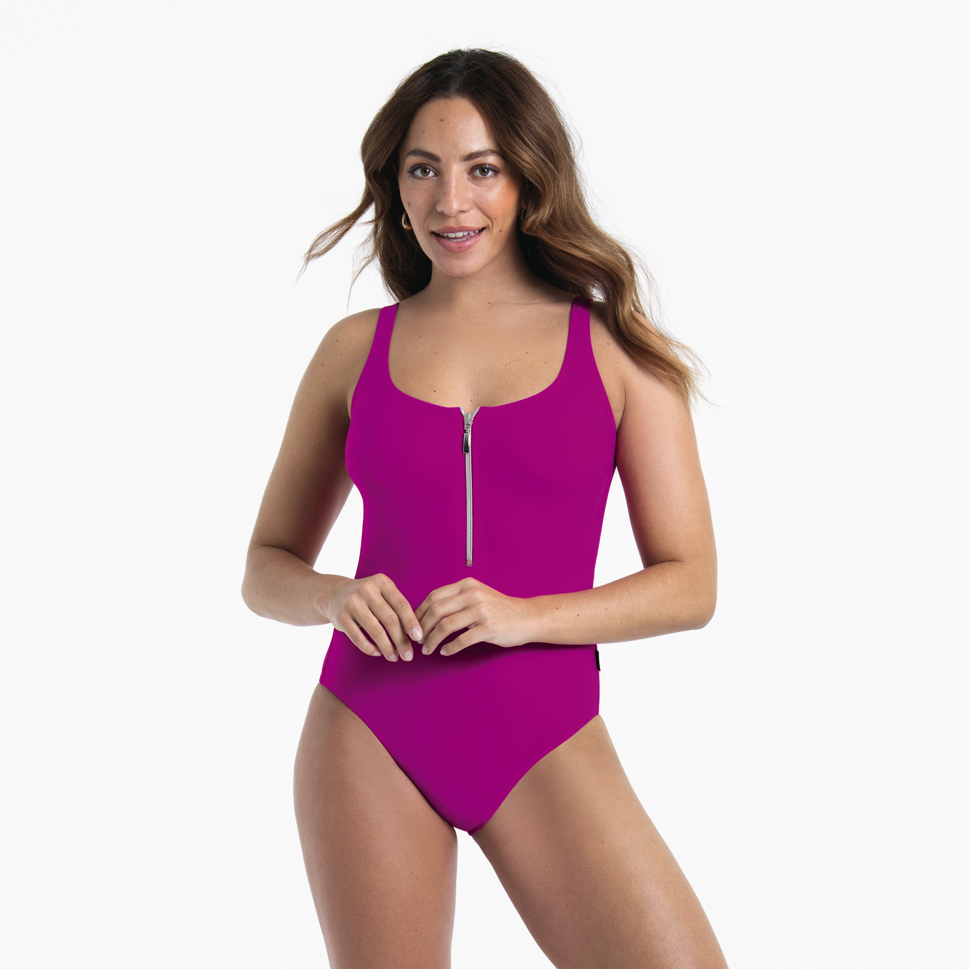 Verleidelijke elementen zoals een ritssluiting in het midden om open te maken en een bijzonder lage ruguitsnijding creëren een zinnelijke beachlook met een zweem van luxe.